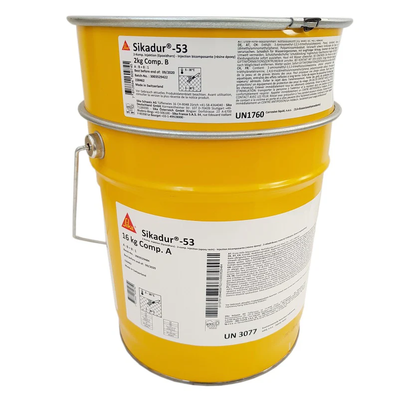 Bezrozpuszczalnikowa, dwuskładnikowa, niewrażliwa na wilgoć, płynna żywica epoksydowa, która zawiera specjalne wypełniacze. Gęsta żywica Sikadur-53 stosowana jest do iniekcji oraz wykonywania mocowań, zakotwień i napraw, także pod wodą. Przeznaczona jest do aplikacji w temperaturze od +5°C do +30°C.